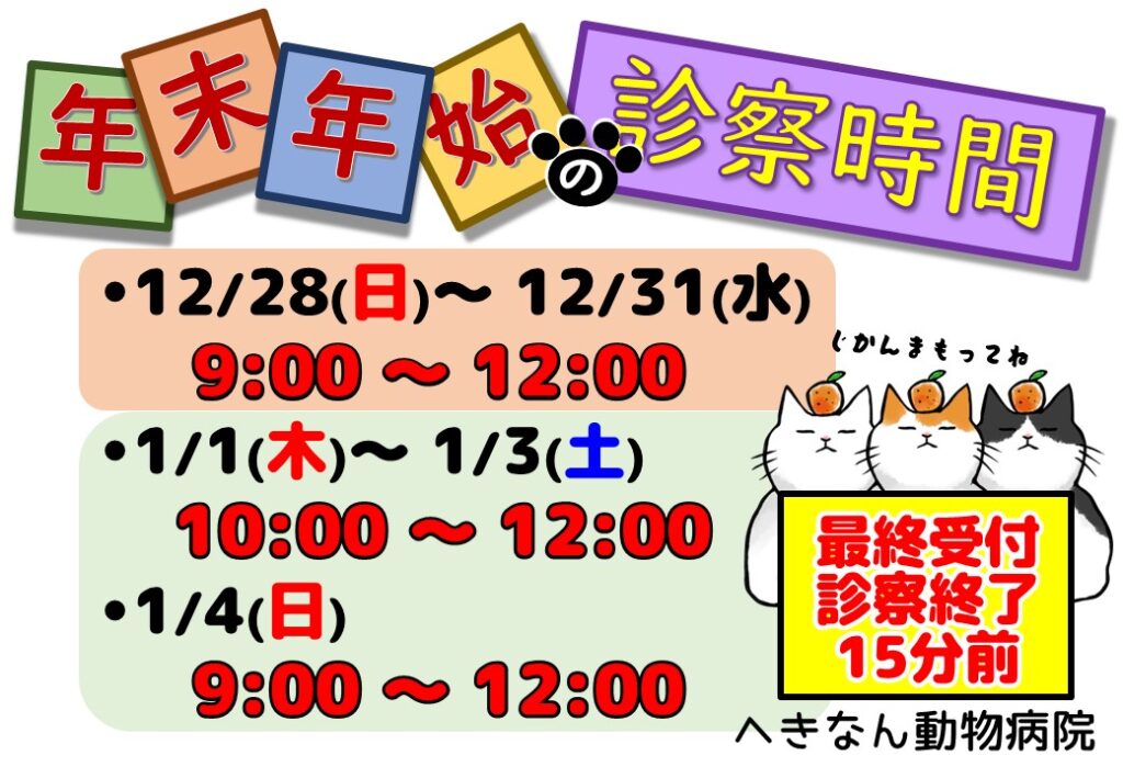 2025年12月28日(日)~2026年1月4日(日)まで診察、トリミングともに午前中のみの短縮営業となります、ご了承下さい。